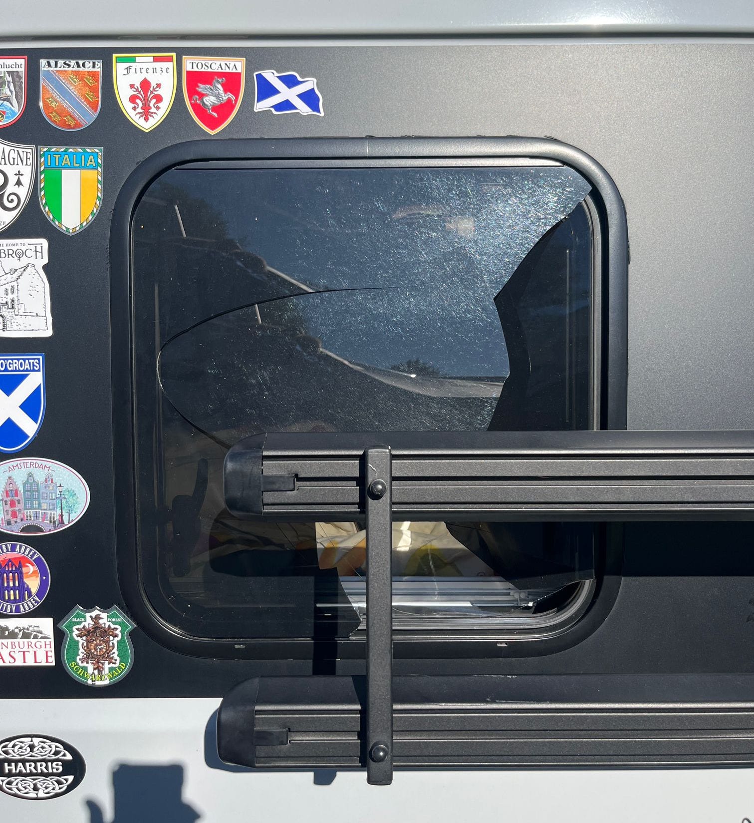 La toile de quatre mètres sur trois, tendue depuis le toit de son véhicule et maintenue par deux piquets plantés au sol, a suivi comme elle pouvait le mouvement du camping-car qui démarrait… et le montant métallique, épais comme une poutre, s’est gentiment encastré dans la fenêtre arrière de Zébulette.